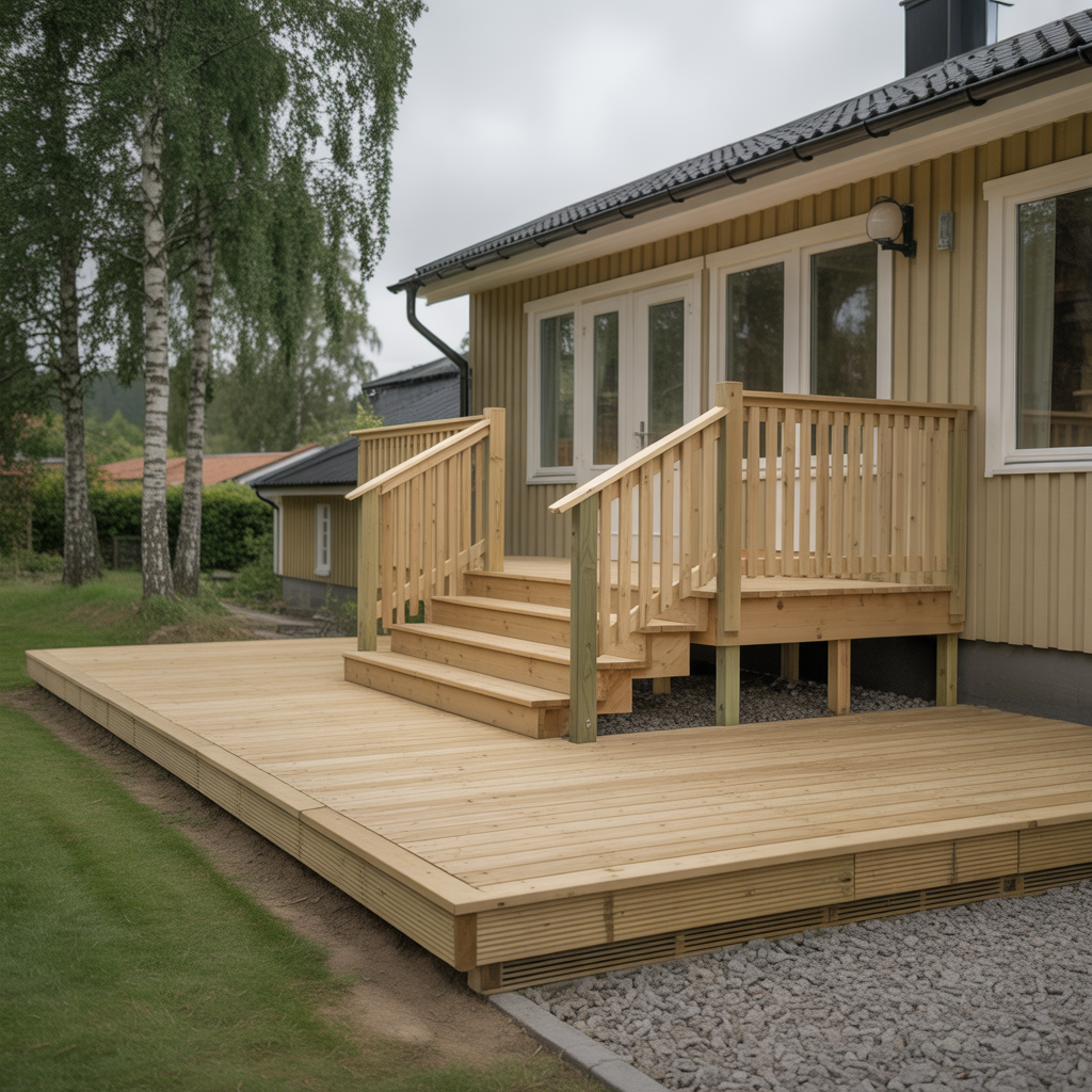 Uppdraget gällde anläggning av en ny träaltan med trappor och räcken vid en privatbostad i Sparreholm, Flen, Södermanlands län. Vi började med inmätning, snörslagna linjer och kontroll av nivåer mot befintlig fasad och dörrtrösklar. Placering och storlek anpassades efter tomtens fall, sol- och vindförhållanden samt passager till trädgård och entré. För att minimera fuktrisk och […]